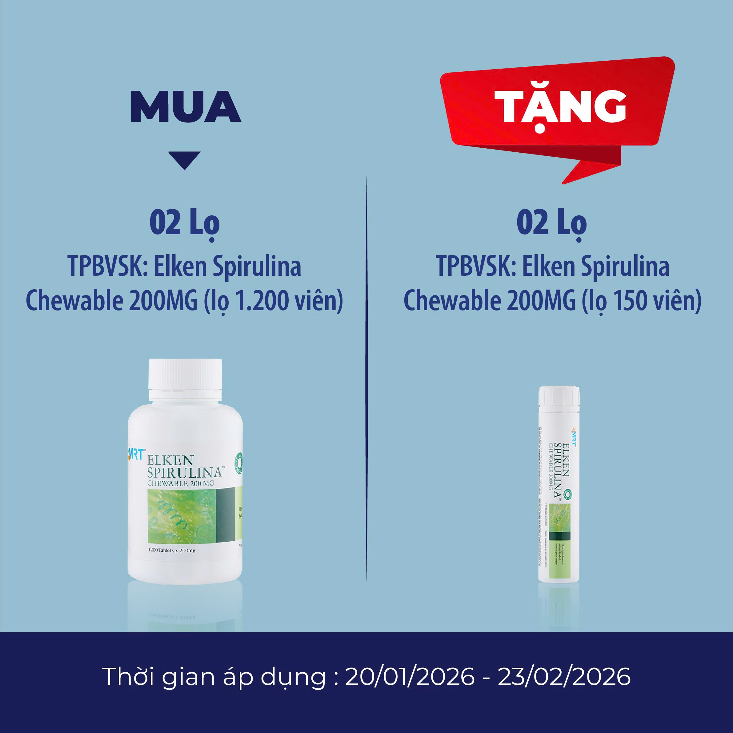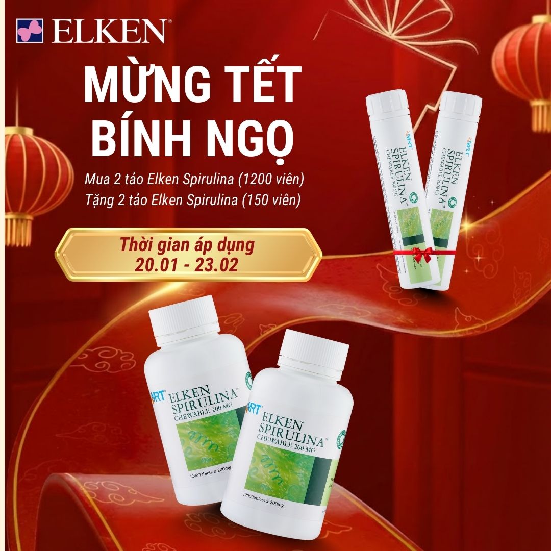 MUA 02 TPBVSK ELKEN SPIRULINA CHEWABLE 200MG (LỌ 1.200 VIÊN) - TẶNG 02 TPBVSK ELKEN SPIRULINA CHEWABLE 200MG (LỌ 150 VIÊN)