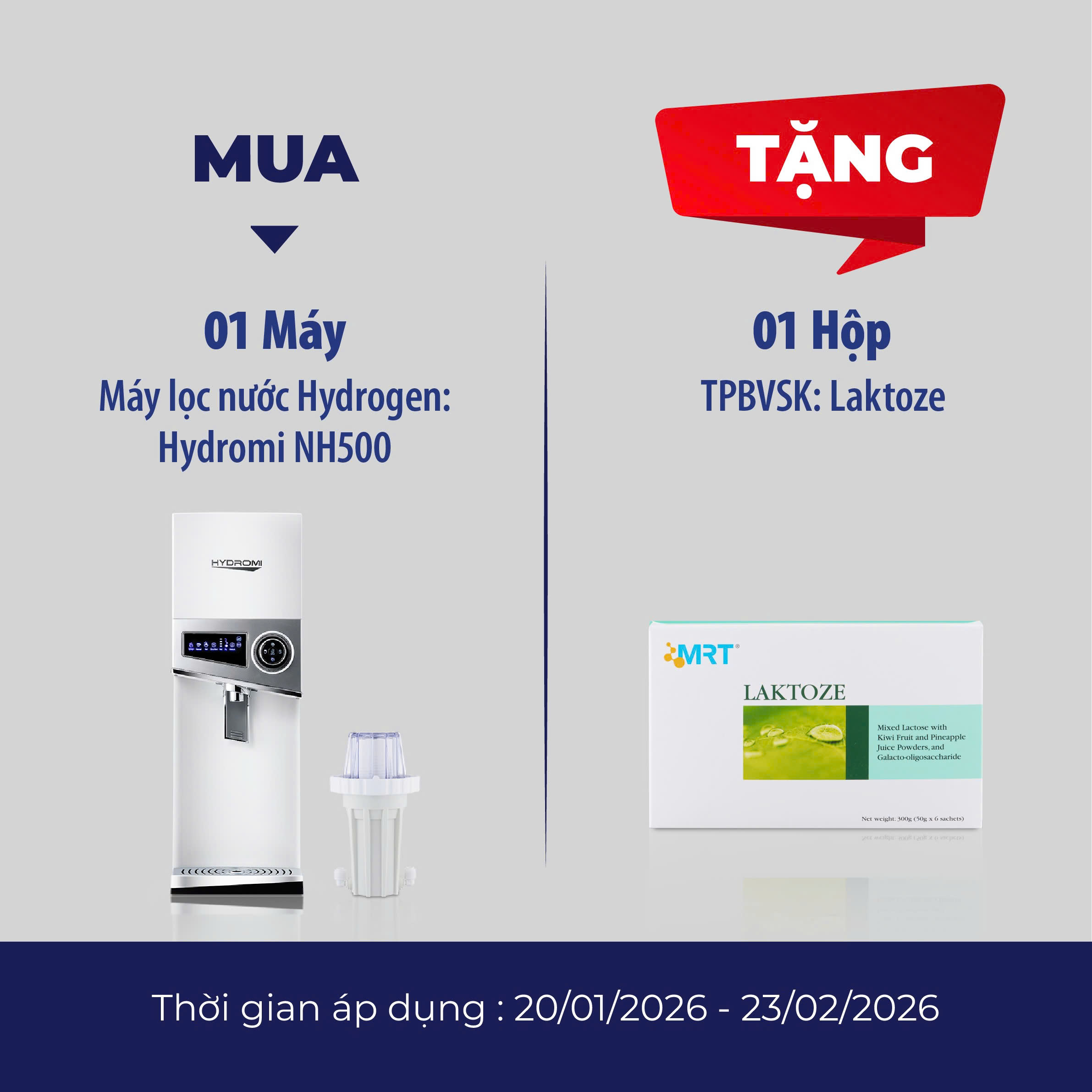 MUA 01 MÁY LỌC NƯỚC HYDROGEN HYDROMI NH500 - TẶNG 01 TPBVSK LAKTOZE (HỘP 6 GÓI)