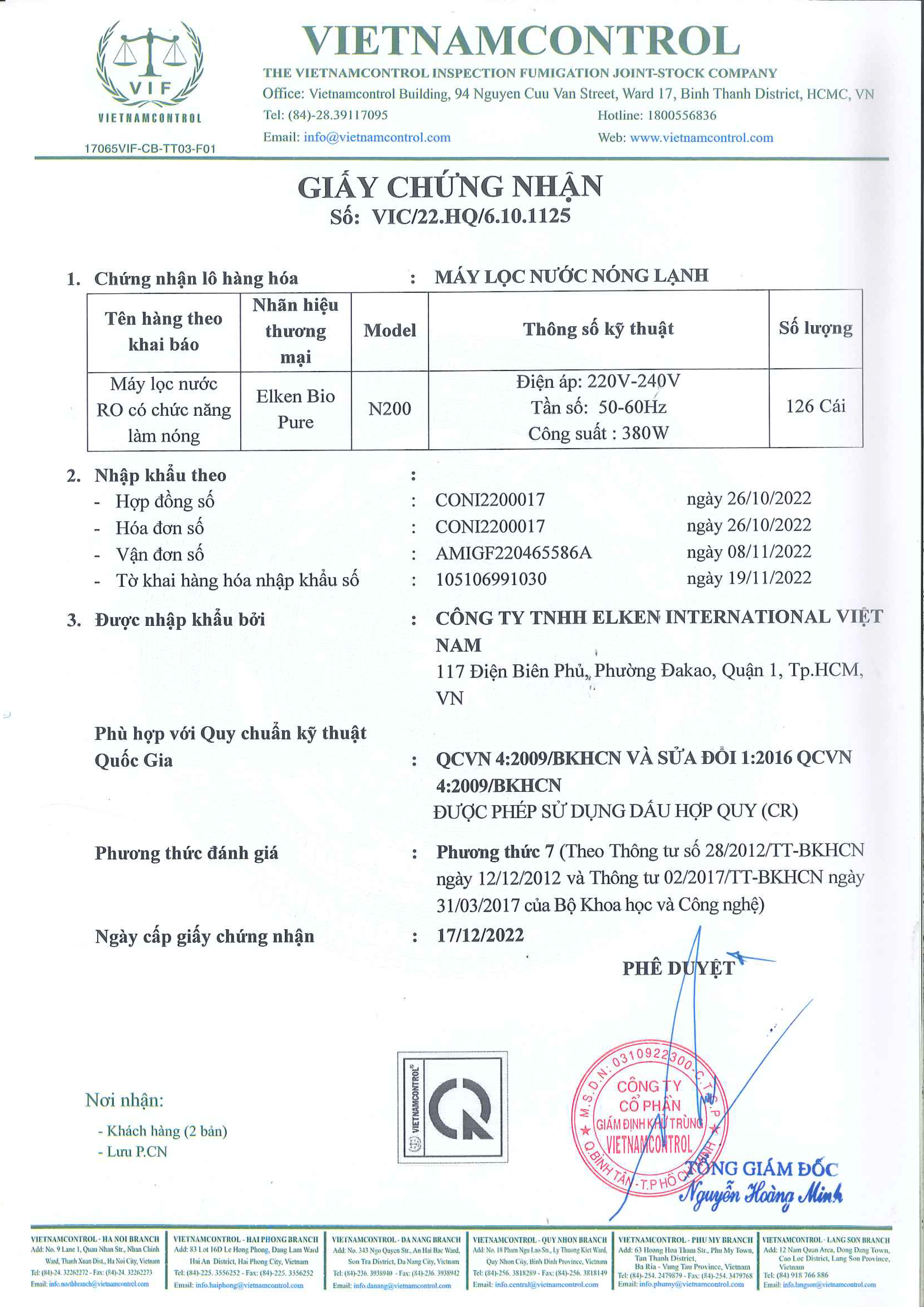 - Máy lọc nước R.O có chức năng làm nóng: Elken Bio Pure N200, Máy tạo khí Hydrogen: Genqi H150A: Xuất xứ: Trung Quốc. Nhà sản xuất: Conitech (Tianjin) Co., Ltd. Địa chỉ: 156, Blk 22, Nan Hai Road, TEDA, Tianjin, China 300457.